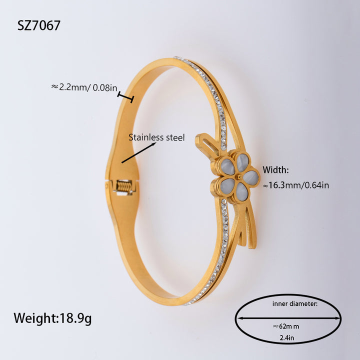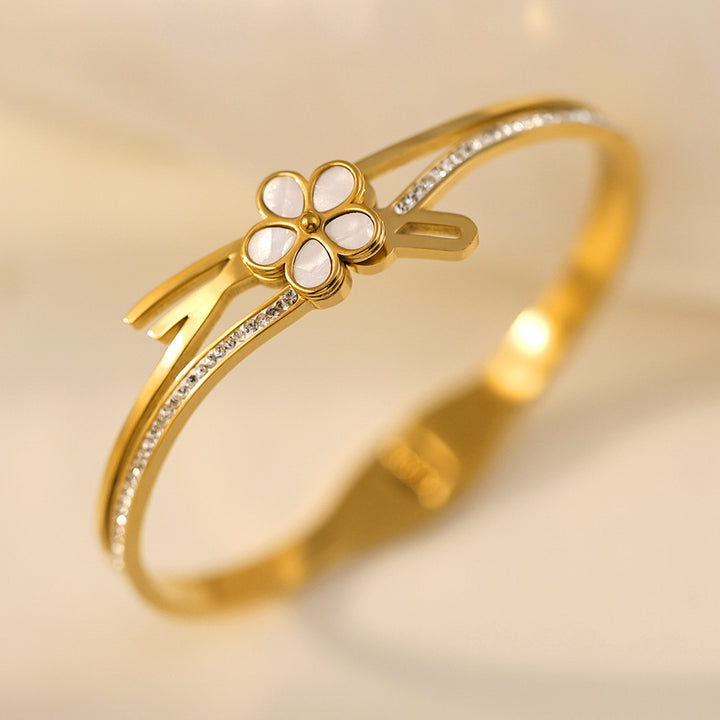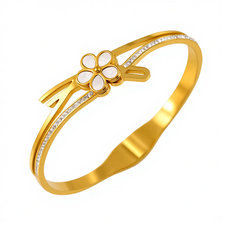 Elevate your style with the Little Flower 18KĀ Ā from Zi Collection Hub, a symbol of luck and elegance. This exquisite gold-toned bangle is adorned with a series of clover motifs, each featuring a black enamel center that contrasts beautifully with the gold. The design is further enhanced with small, clear gemstones set at the center of each clover, adding a touch of sparkle.Key Features: